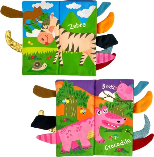 - Sensorische stimulatie: knisperende pagina’s, diverse texturen en vormen van staarten.