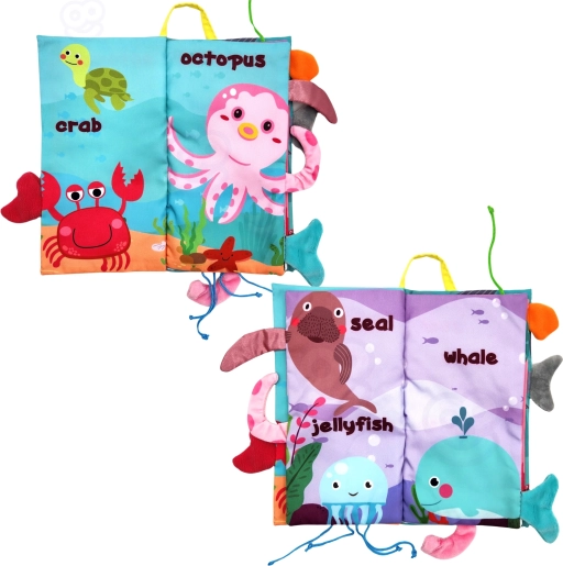 Ontdek het speelse stoffen boekje van WOOPIE met zeedieren, dat zintuiglijke waarneming, ontwikkeling van het zicht en oog-handcoördinatie combineert. De zachte pagina’s met knisperende elementen, kleurrijke illustraties en uitstekende staarten nodigen uit tot ontdekken, terwijl de praktische klittenbandsluiting het boekje eenvoudig aan een kinderwagen of ledikant bevestigt.