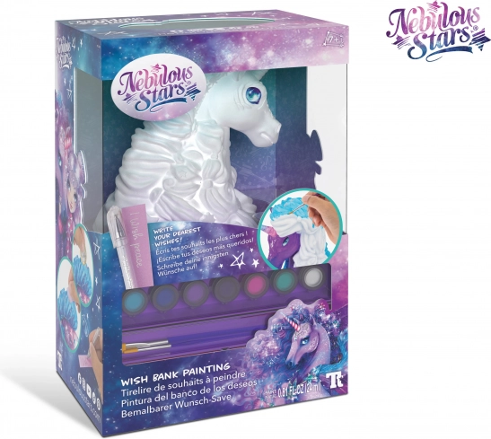 Nebulous Stars Wenspaarpot. Set: schilder je eigen wenspaarpot. Inhoud van de verpakking: spaarpot, 7 acrylverven, glanslak met glitter, 2 penselen, 75 steentjes, mini gelpen, mini dagboekje, handleiding.