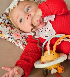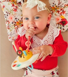 Gemaakt van 100% veilige BPA-vrije siliconen. Zachte randen en verschillende texturen masseren het tandvlees voorzichtig en verlichten bij doorkomende tandjes.