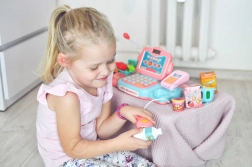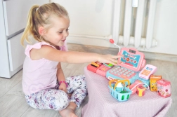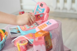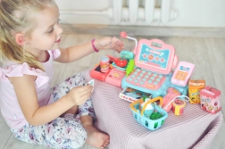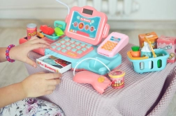 De functionele toetsenbord, geldlade en terminal laten kinderen prijzen invoeren en kiezen voor contante betaling of met kaart.