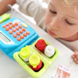 De ingebouwde calculator helpt bij het optellen van aankopen, terwijl de lade munten en bankbiljetten veilig opbergt – spelenderwijs leren geld rekenen.