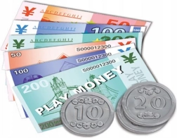 De set bevat een betaalkaart, bankbiljetten, munten, een doosje met koekjes en een plank met artikelen voor compleet winkeltje spelen.