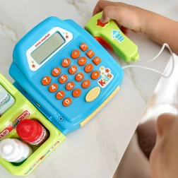 Een leuke en educatieve kinderkassa van het merk WOOPIE met een uittrekbare lade, een functionele calculator en een scanner met geluiden. Ideaal voor winkeltje spelen, het ontwikkelen van communicatie, basisrekenen en fijne motoriek. Kinderen kunnen betalen met munten, bankbiljetten of betaalkaart en de goederen neerzetten op een praktische plank.