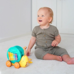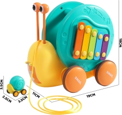 Deze multifunctionele slak van het merk WOOPIE springt meteen in het oog bij kinderen. De kleurrijke schelp dient als xylofoon met toetsen waarop getikt kan worden met de uitneembare “oogjes” – de stokjes. Dankzij het stevige koord kunnen kinderen de slak trekken en duwen, waardoor oog-handcoördinatie en balans zich ontwikkelen. Op de rug zit een knop die de lanceerbaan opent voor het kleine auto-slakje en zorgt voor talloze vrolijke momenten.