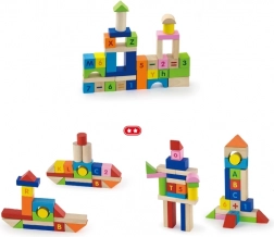 Kleurige blokken van duurzaam hout met opdruk van letters, cijfers en wiskundige tekens ondersteunen leren door spel en zijn bestand tegen dagelijks gebruik.