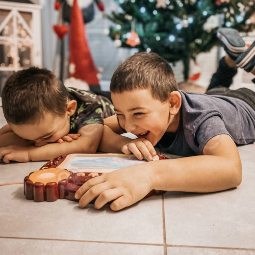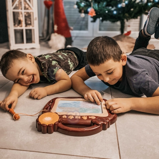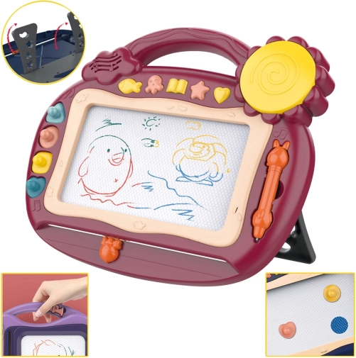 Dankzij het praktische handvat neem je het bord gemakkelijk mee op reis of naar de opvang, en de uitklapbare pootjes zorgen voor comfortabel schrijven aan tafel. Inclusief een magnetische pen en 4 stempels, die kinderen aanzetten tot creativiteit en hun fijne motoriek verbeteren.