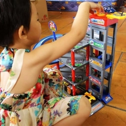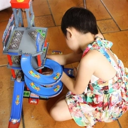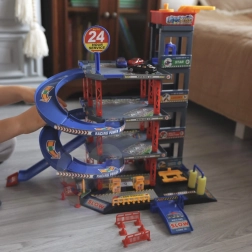 Lange, gedraaide afritten laten auto’s snel en soepel tussen de verdiepingen rijden. Een geweldige combinatie van snelheid, skills en plezier voor kleine racers.