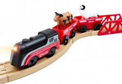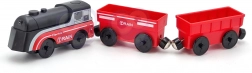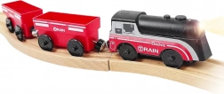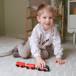 De set maakt gebruik van magnetische koppeling van de wagonnetjes voor snel en intuïtief verbinden. De locomotief wordt gevoed door één AAA-batterij (niet inbegrepen), licht op tijdens het rijden en beweegt soepel als een echte trein. Dankzij de standaard spoorbreedte is hij compatibel met de meeste houten sporen (spoorbreedte ca. 4 cm, asbreedte ca. 2,5 cm) – een perfecte aanvulling op sets van IKEA, Brio en meer.