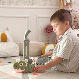 Ontdek de magie van dominobanen met de schattige groene dinosaurus die steentjes in een perfecte rij “uitblaast”. Vul het reservoir, druk op de knop en kijk hoe het speelgoed automatisch domino op de vloer legt. Licht- en geluidseffecten maken het spel nog leuker en motiveren kinderen om verder te experimenteren.