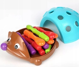 Deze educatieve speelgoedset is ideaal voor de eerste stapjes in leren door spel. Grote ergonomische onderdelen passen in kleine handjes, en de opvallende kleuren nodigen uit tot sorteren en het maken van eenvoudige reeksen. De genummerde schelp stimuleert vroeg tellen en het onderscheiden van kleuren, terwijl het plaatsen van de stekels de fijne motoriek en het geduld traint.