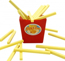 Inhoud van de doos: frietbakje, set frietjes (inclusief twee “verkeerde” frietjes die alles laten opspringen).