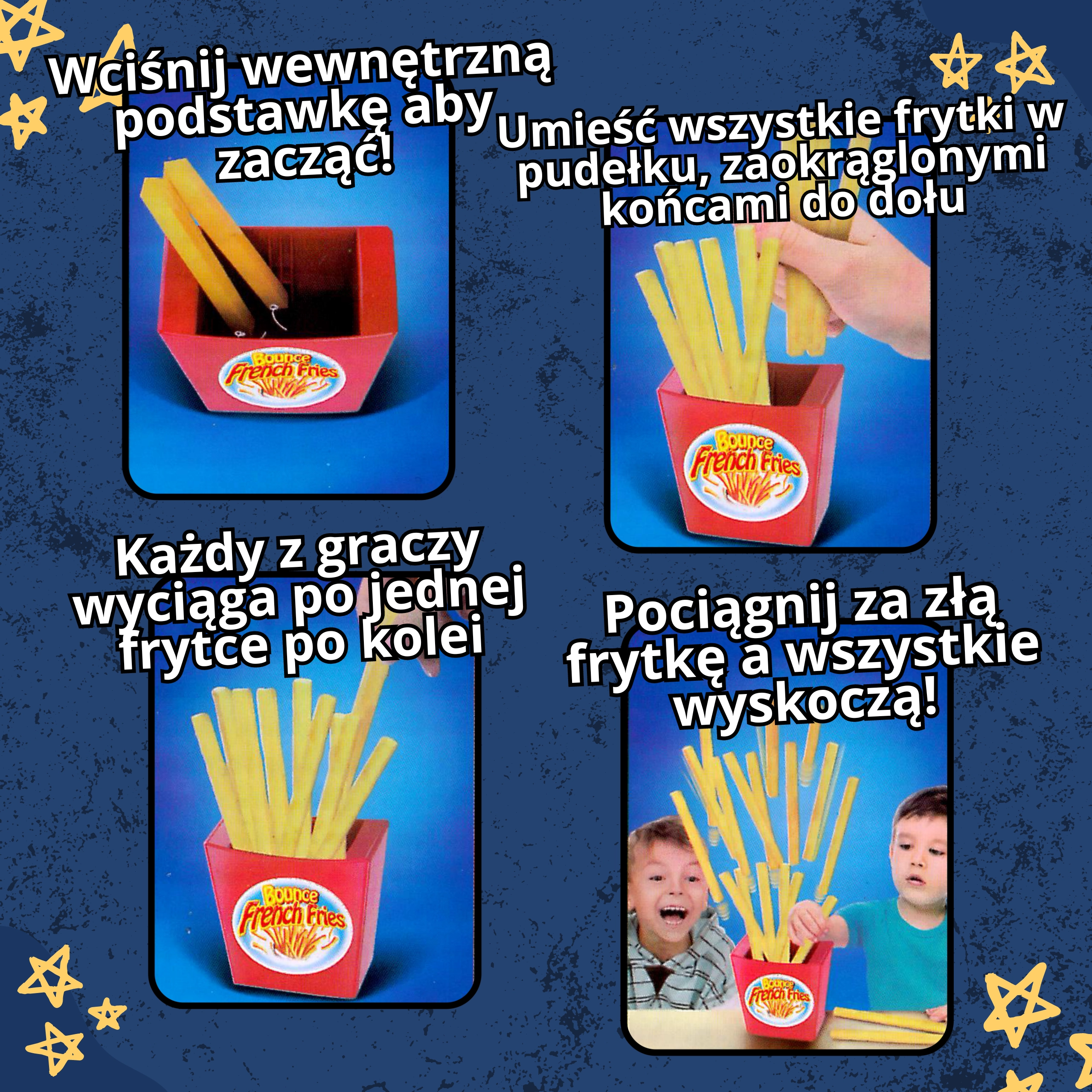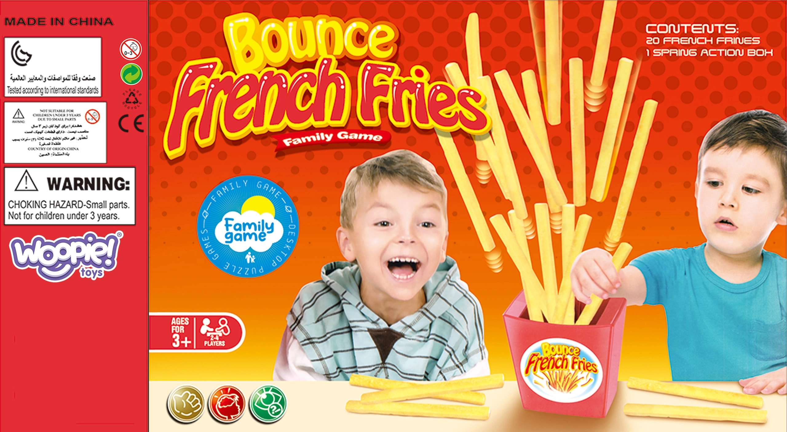 Het spel Springende frietjes van WOOPIE is een snel en verslavend partyspel voor kinderen en volwassenen. Het doel is om voorzichtig frietjes uit het bakje te trekken zonder een “explosie” te veroorzaken. Licht, compact en direct te begrijpen – ideaal voor gezellige avonden met familie of vrienden.