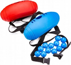 • Complete set voor twee: rode en blauwe box met riem + 24 plastic ballen (12 rood, 12 blauw).