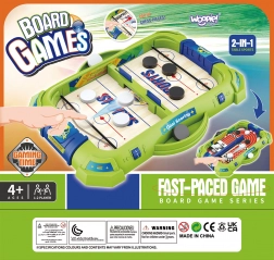 Op beide helften van het bord zitten elastieken om de puck weg te schieten. In het midden bevindt zich een wand met een kleine opening om het spel te starten. Aan de zijkanten zijn twee plankjes waar je de gewonnen pucks kunt plaatsen. Elke speler krijgt 3 pionnen - span het elastiek met een pion en schiet naar het veld van de tegenstander! Het doel van het spel - net als bij hockey - is om meer doelpunten te maken dan je tegenstander.
