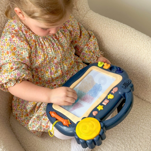 Het magnetische oppervlak is eenvoudig te wissen met de schuifregelaar. Met vier stempels en de meegeleverde stylus maakt je kind steeds opnieuw tekeningen – zonder papier en zonder rommel.