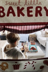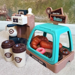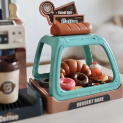 De WOOPIE kindercaféset biedt een authentieke koffie-ervaring – giet water in het reservoir, plaats de hendel, zet het bekertje eronder en de “koffie” is klaar. Tijdens het malen en zetten klinken realistische geluiden, brandt een rood lampje en na afloop gaat een groene indicator aan met een geluidssignaal. De vitrine met donuts, croissants en andere lekkernijen zorgt voor de sfeer van een kleine bakkerij.