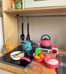 De set is gemaakt van veilige materialen en de gedetailleerde nabootsing van echte keukentools zorgt voor veiligheid en duurzaamheid. Voor dit speelgoed zijn geen batterijen nodig en het is bovendien compact, waardoor het gemakkelijk op te bergen is.