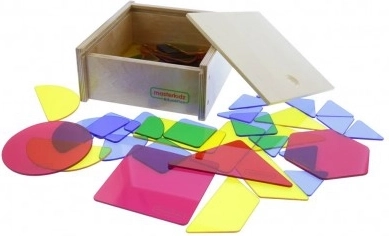 Een set doorzichtige, gekleurde plaatjes in verschillende vormen waarmee het oefenen van het leggen van geometrische vormen eenvoudig en toegankelijk wordt. De onderdelen zijn gemaakt van duurzaam acryl in nauwkeurige kleuren, waardoor kinderen ook kennis opdoen over het mengen van kleuren, bijv. rood + geel = oranje. Ideale combinatie met de LED-lichttafel Masterkidz Education. De set wordt geleverd in een stevige houten kist, wat het opbergen vergemakkelijkt.