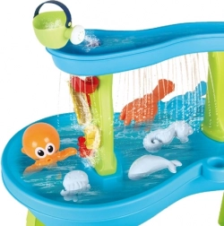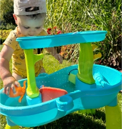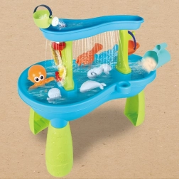 Kinderen gieten water in het bovenste deel van de tafel en volgen de stroom door watermolens en openingen voor een leuk watereffect.