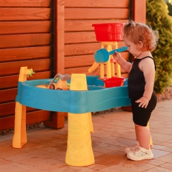 Zoek je een veelzijdige speeltafel voor in de tuin, op het terras of in de kinderkamer? Deze 2-in-1 water- en zandtafel heeft gescheiden compartimenten voor water en zand, zodat kinderen kunnen scheppen, strooien en gieten zoals op het strand. De watermolen gaat draaien tijdens het gieten en stimuleert het begrip van oorzaak en gevolg.