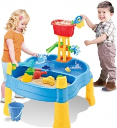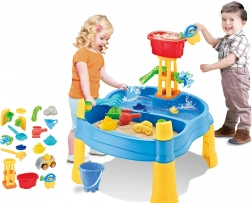De uitgebreide set met 14 accessoires (vormpjes, gieter, molen, schep, harkjes, autootje en 2 bootjes) bevordert fantasie, oog-handcoördinatie en samenspel met meerdere kinderen. Dankzij de stabiele kunststof constructie is de tafel geschikt voor buiten en binnen en bovendien makkelijk schoon te maken.