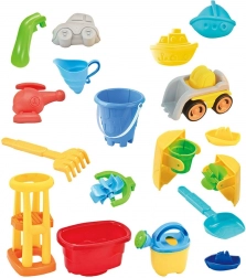 Vormpjes, gieter, schep, harkjes, autootje en twee bootjes stimuleren creatief bouwen, gieten en samen spelen met meerdere kinderen.