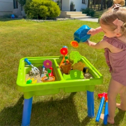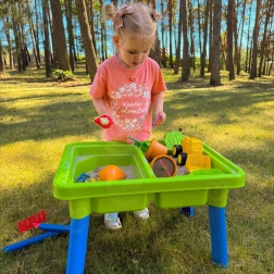 Ontdek de veelzijdige 2-in-1 WOOPIE speeltafel, die waterpret en zandscheppen combineert in één compacte set. Twee afzonderlijke vakken laten je de ene met water en de andere met zand vullen, zodat kinderen tegelijk kunnen scheppen, gieten, zeven en vormen.