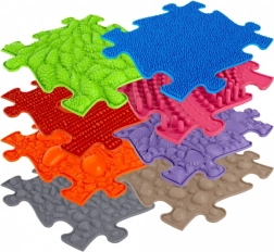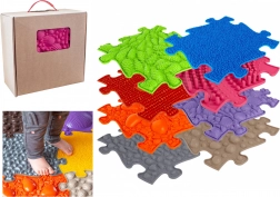 De sensorische orthopedische mat, samengesteld als een puzzel, heeft oppervlakken met verschillende hardheden en structuren die elkaar perfect aanvullen. Harde elementen, zoals kegels en schelpen, stimuleren en versterken de voetboog, terwijl grotere stenen helpen de spieren te belasten en het gevoel voor verschillende oppervlakken te trainen. Zachtere oppervlakken zoals gras en oceaangolven dienen als voorbereiding of ontspanning.