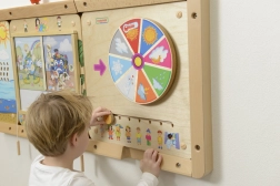 Met behulp van het draaibare wiel en de schuif op het bord kunnen kinderen verschillende weersomstandigheden leren kennen en ontdekken welke kleding daar het best bij past.