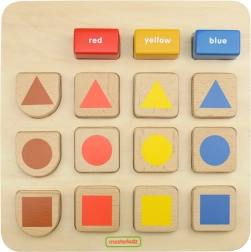 Deze hoogwaardige houten didactische set van MASTERKIDZ ontwikkelt herkenning van vormen (cirkel, vierkant, driehoek e.a.) en kleuren (rood, geel, blauw). Kinderen plaatsen de stukjes op de juiste posities volgens kleur of vorm en maken tegelijkertijd kennis met Engelse benamingen die op de blokken zijn gedrukt.