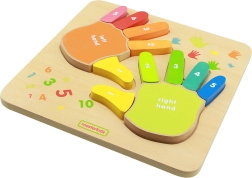 De houten vingerrekentabel van MASTERKIDZ is een ideaal leermiddel voor peuters en jonge schoolkinderen. Gekleurde vingerdelen zijn genummerd en benoemd, net als de volledige handpalmen – rechts en links. Zo koppelen kinderen eenvoudig de namen van de vingers aan de cijfers en passen ze de opgedane vaardigheden toe op hun eigen handen.