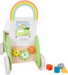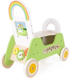 Het karretje is afgewerkt met niet-giftige verven en gemaakt van natuurlijke materialen, geïnspireerd door Montessori-principes. Kleurrijke details, vormactiviteiten en tandwielen prikkelen het herkennen van vormen en kleuren en ondersteunen het logisch denken.