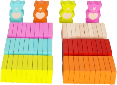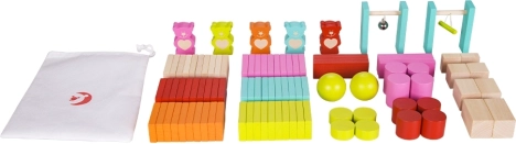 Deze kleurrijke set houten domino zorgt voor uren speelplezier. Je vindt er rechthoekige stenen, berenfiguren, cilinders, blokjes, ballen, poortjes met een belletje en met een dwarslat, plus een stoffen zakje. De combinatie van natuurlijk hout en zes opvallende kleuren inspireert tot fantasie, het bouwen van banen en kleurrijke sequenties.