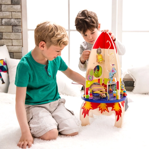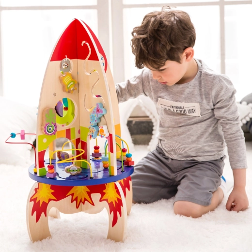 De raket bevat diverse interactieve elementen zoals doolhoven, kleurrijke kralen, een klok om de tijd te leren en een spiegel. Al deze elementen zijn ontworpen om de fijne motoriek en creativiteit te stimuleren.