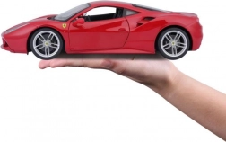 Gedetailleerde uitvoering van de rode Ferrari 488 GTB met authentieke proporties, logo’s en sportvelgen op schaal 1:18.
