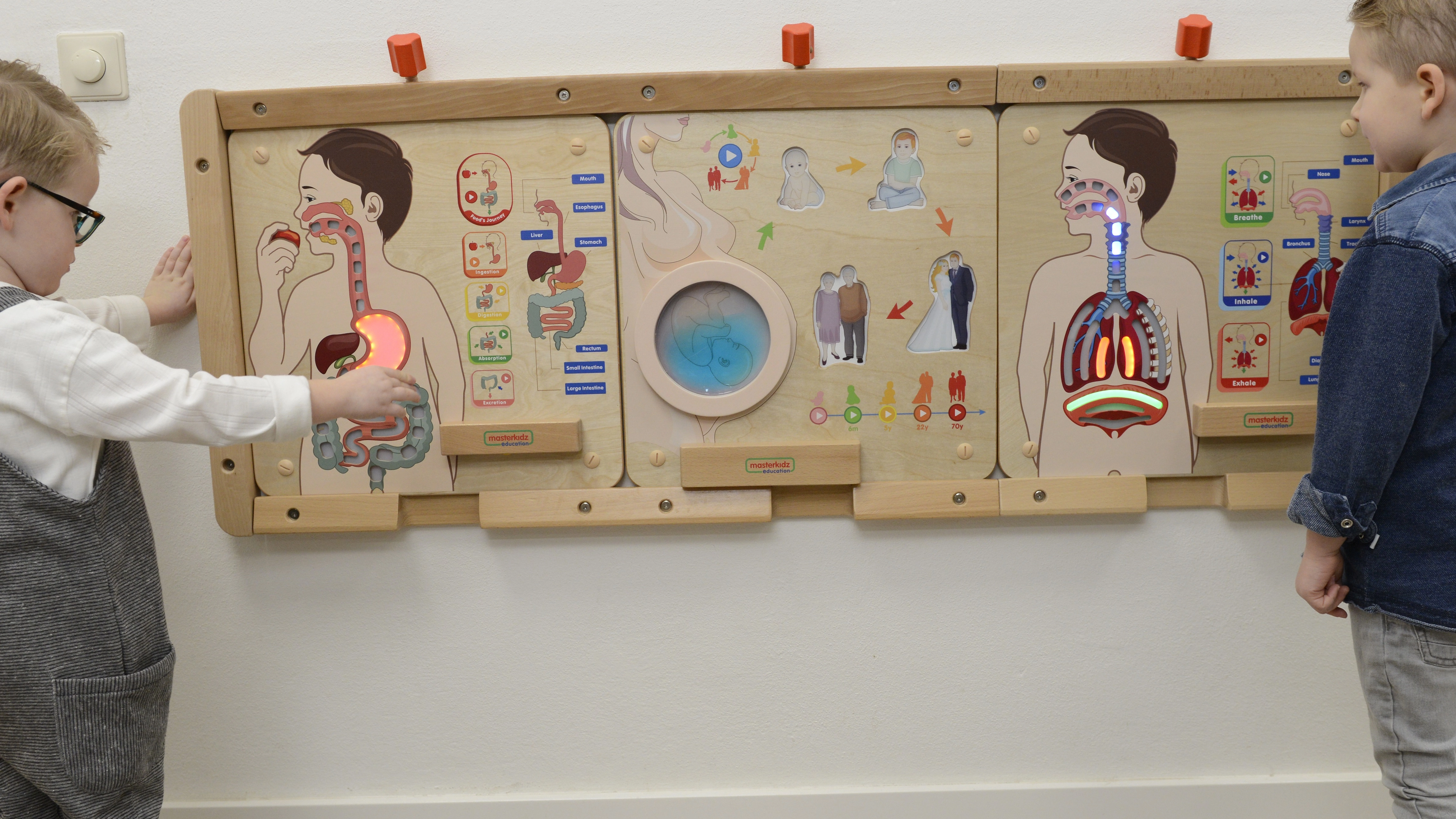 Lichtelementen tonen stap voor stap hoe voedsel door het lichaam reist – van de mond via de maag tot in de darmen. Kinderen onthouden het proces gemakkelijk.