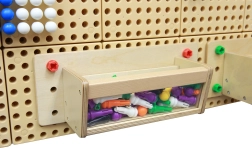 Houd het werkvlak op het STEM-bord overzichtelijk en georganiseerd. De houten voorraadbak met transparante voorwand maakt het voor kinderen én volwassenen gemakkelijk om snel de benodigde MASTERKIDZ-pinnen, -schroeven en -koordjes te zien en te pakken, zonder naar verre bakken te hoeven reiken. Hij wordt direct op het bord gemonteerd, zodat je het belangrijkste altijd binnen handbereik hebt.