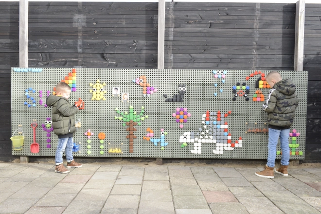 Het geperforeerde oppervlak maakt het mogelijk om kleurrijke afbeeldingen, letters en cijfers te leggen en zo de fantasie en fijne motoriek te ontwikkelen.