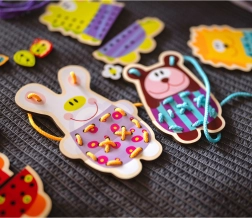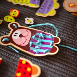 Rijgen en het manipuleren van de onderdelen helpt bij het versterken van de kleine spieren in handen en vingers, wat belangrijk is als voorbereiding op schrijven.