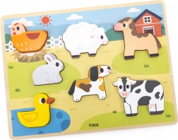 Ontdek de leuke houten Viga-puzzel met boerderijthema – set met 1 kleurrijke onderplaat en 7 dierenfiguurtjes. Kinderen oefenen tijdens het spelen hun fijne motoriek, oog-handcoördinatie, logisch denken en geheugen. Dankzij de dikkere puzzelstukken kunnen de dieren ook gebruikt worden als losse figuren voor creatief spel.