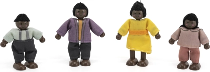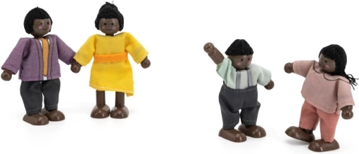 Viga houten poppenfamilie met textielen kleertjes, 4 stuks, donkere huid