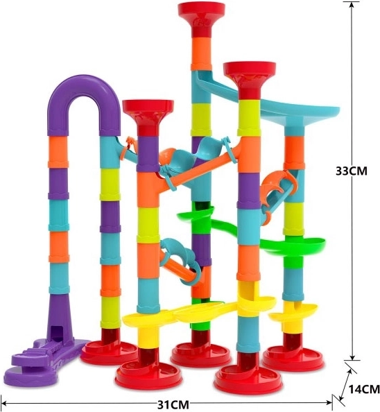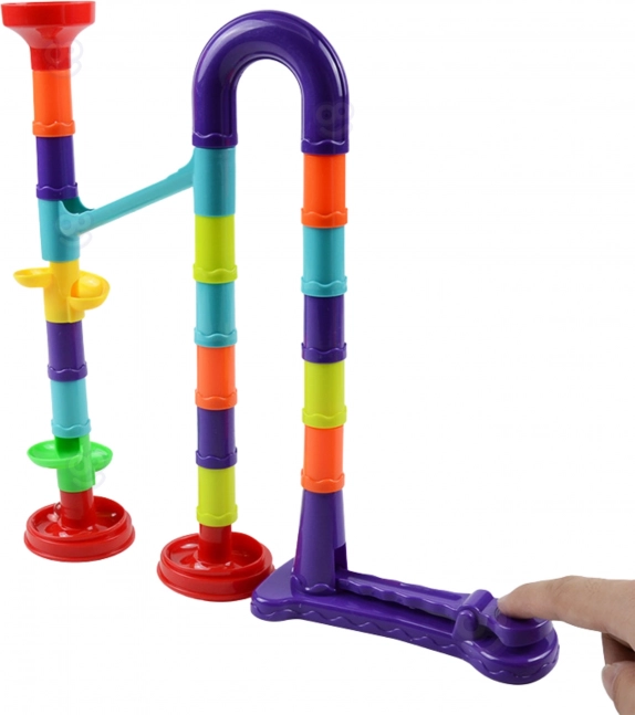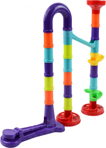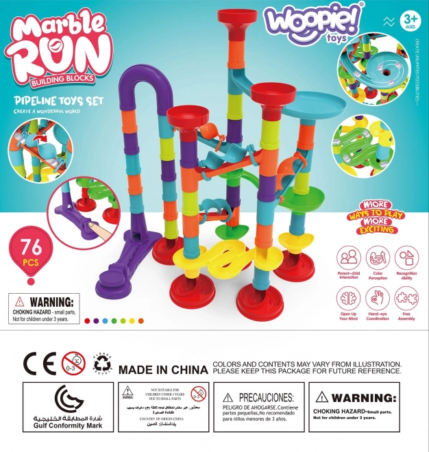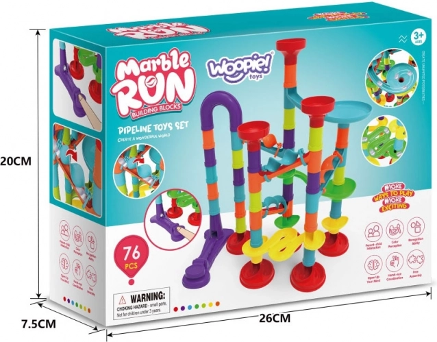 De creatieve bouwset van de knikkerbaan WOOPIE is de ideale speelgoedkeuze voor nieuwsgierige kinderen. Dankzij de vrolijke kleuren en verschillende vormen van buizen, trechters en bochten bouwen kinderen gemakkelijk hun eigen originele banen en kijken ze hoe de knikkers achter elkaar naar beneden zoeven.