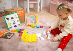 De educatieve box bevat verschillende activiteiten, zoals vormensorteren, dierenpuzzels en gekleurde optische platen die het visuele voorstellingsvermogen en de fijne motoriek ontwikkelen. Andere activiteiten zijn bijvoorbeeld een regenboogtelraam dat basisrekenen stimuleert, en een Montessori knikkerbaan die de oog-handcoördinatie verfijnt. Er zijn ook boekjes die kinderen helpen de relatie tussen groot en klein te begrijpen, naast vele andere creatieve oefeningen.