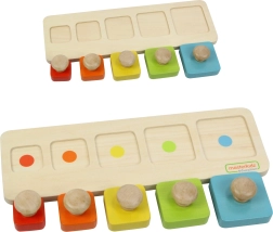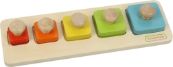 Houten educatief speelgoed voor kinderen vanaf 2 jaar, bestaande uit vijf vierkante blokken in verschillende kleuren met handgrepen, die het plaatsen in de uitsparingen op de houten basis vergemakkelijken. Elk blok is voorzien van een houten knopgreep, wat het vastpakken eenvoudiger maakt.