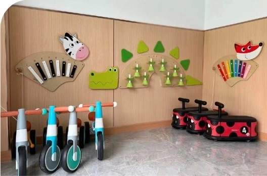 Het wandontwerp bespaart ruimte en creëert een aantrekkelijke zone voor gezamenlijk spel en muzikale ontwikkeling.
