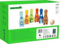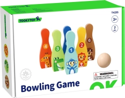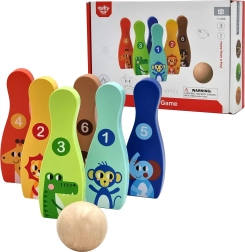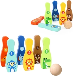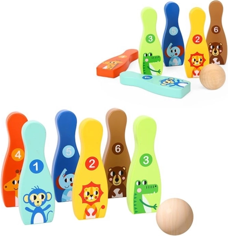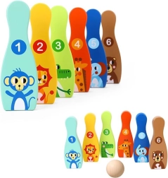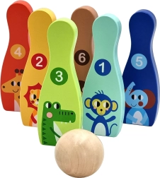 De houten bowlingset met zes kleurrijke kegels en een bal is een ideale spelactiviteit voor de kinderkamer. Elke kegel heeft een dierenmotief en nummering 1–6, waardoor kinderen tijdens het spelen op natuurlijke wijze leren tellen, kleuren herkennen en motorische vaardigheden ontwikkelen.