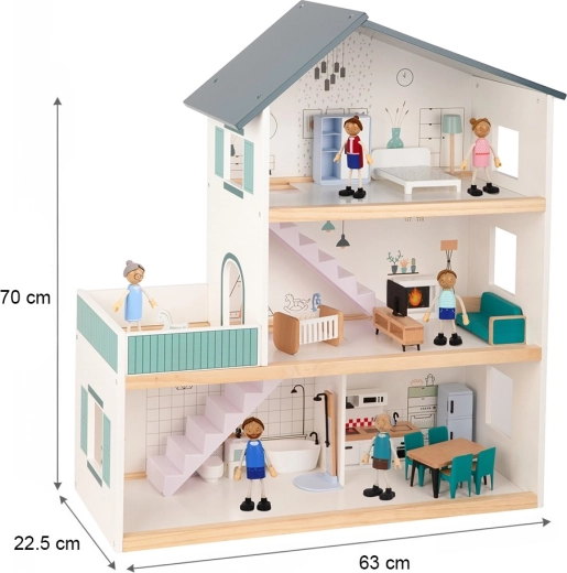 Het poppenhuis van hoogwaardig hout biedt een modern, open ontwerp met 3 verdiepingen voor gemakkelijke toegang tijdens het spelen. Op de begane grond vind je een keuken met eetgedeelte en een volledig uitgeruste badkamer, op de eerste verdieping een knusse woonkamer met open haard en tv, en op zolder een slaapkamer met bed, kast en een wiegje voor kinderen. Er is ook een balkon voor buitenscènes.