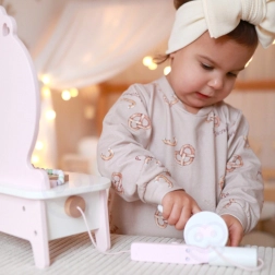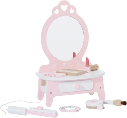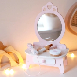 Deze prachtige kinderkaptafel in roze is voorzien van een spiegel en 11 verschillende accessoires, waaronder een kam, lippenstift, stijltang voor het haar, poederdoosje en meer. Alle accessoires zijn gemaakt van kwalitatief hout, en het ontwerp in pastelkleuren geeft het speelgoed een magische uitstraling. De kaptafel biedt voldoende opbergruimte voor alle geheime cosmetische trucjes van je kleine model.