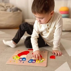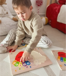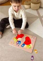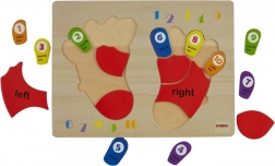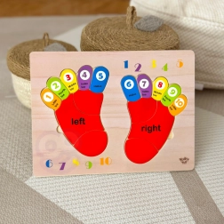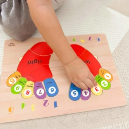 De houten puzzel van TOOKY TOY is een ideaal hulpmiddel voor kinderen bij hun eerste kennismaking met de wiskundewereld. Het bord en al zijn elementen zijn gemaakt van hoogwaardig hout en perfect aangepast aan de grootte van kinderhanden. De gekleurde voetafdrukken zijn gemarkeerd met zijden: links en rechts, en elke teen heeft een toegewezen nummer, wat kinderen helpt hun opgedane kennis toe te passen wanneer ze op hun eigen vingers tellen.